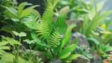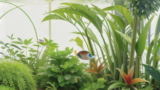 繊細なテープ状の茂みをつくる水草「ブリクサショートリーフ」は、前景から中景に用いられる水槽レイアウトの定番です。